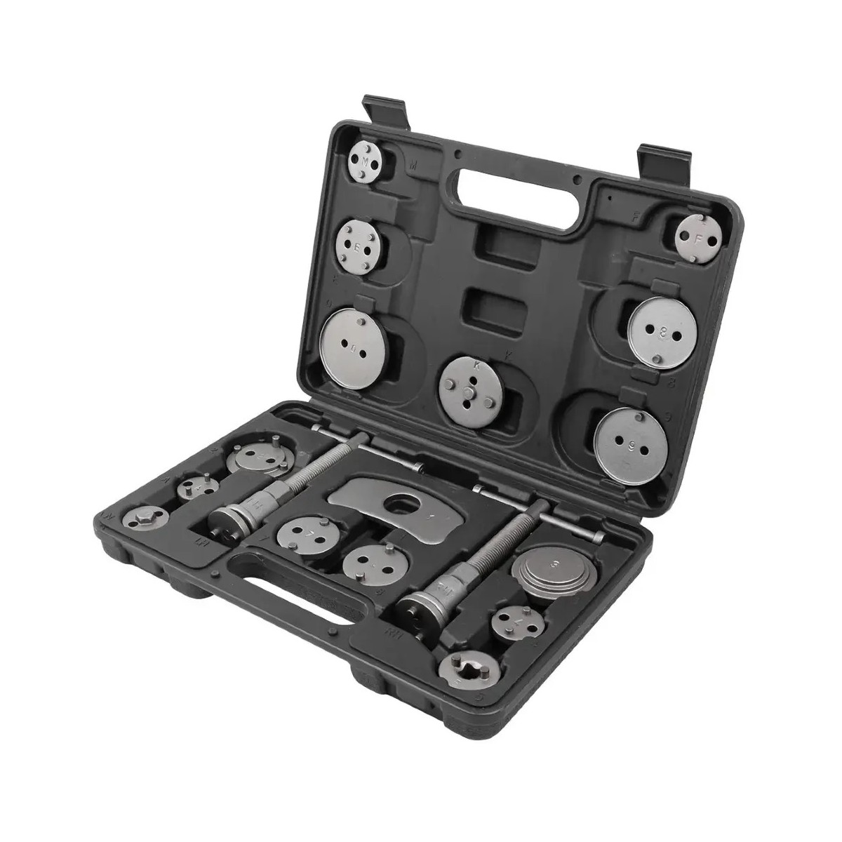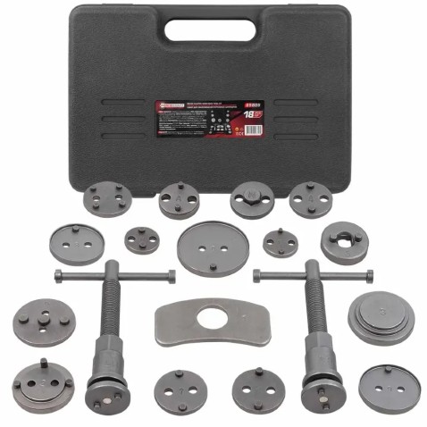 Набір інструментів FORCEKRAFT FK-65805 — це комплексний професійний комплект (18 предметів) для коректного та безпечного обслуговування гальмівних супортів. Інструмент призначений для виконання операцій вдавлювання та вкручування поршнів гальмівних циліндрів при заміні колодок.