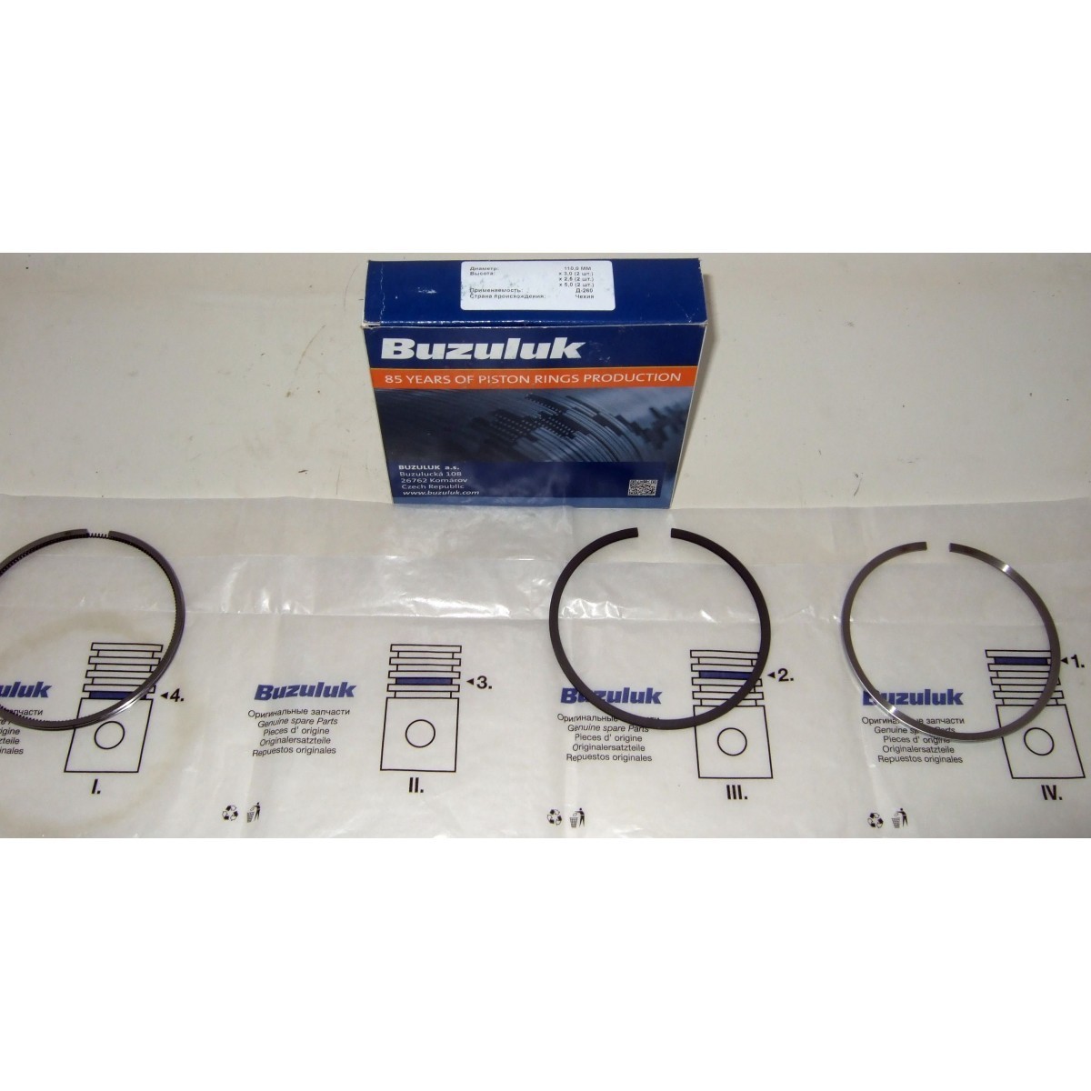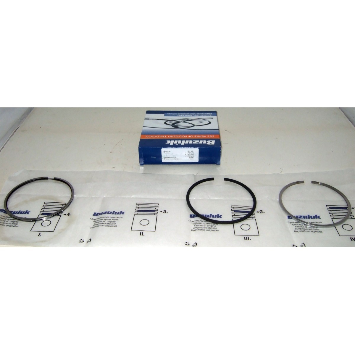 Оригінальні поршневі кільця BUZULUK (Чехія) для дизельних двигунів Д-260 Євро-4 та Д-245 із діаметром циліндра 110 мм. Комплект призначений на 2 поршні (половина двигуна), виготовлений із високолегованого чавуну за сучасною технологією з подальшим хромуванням або молібденовим покриттям.