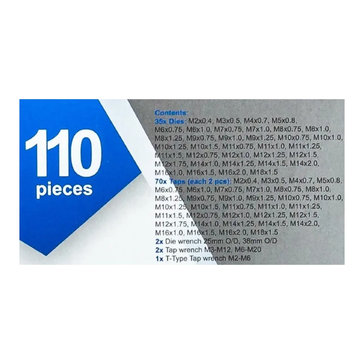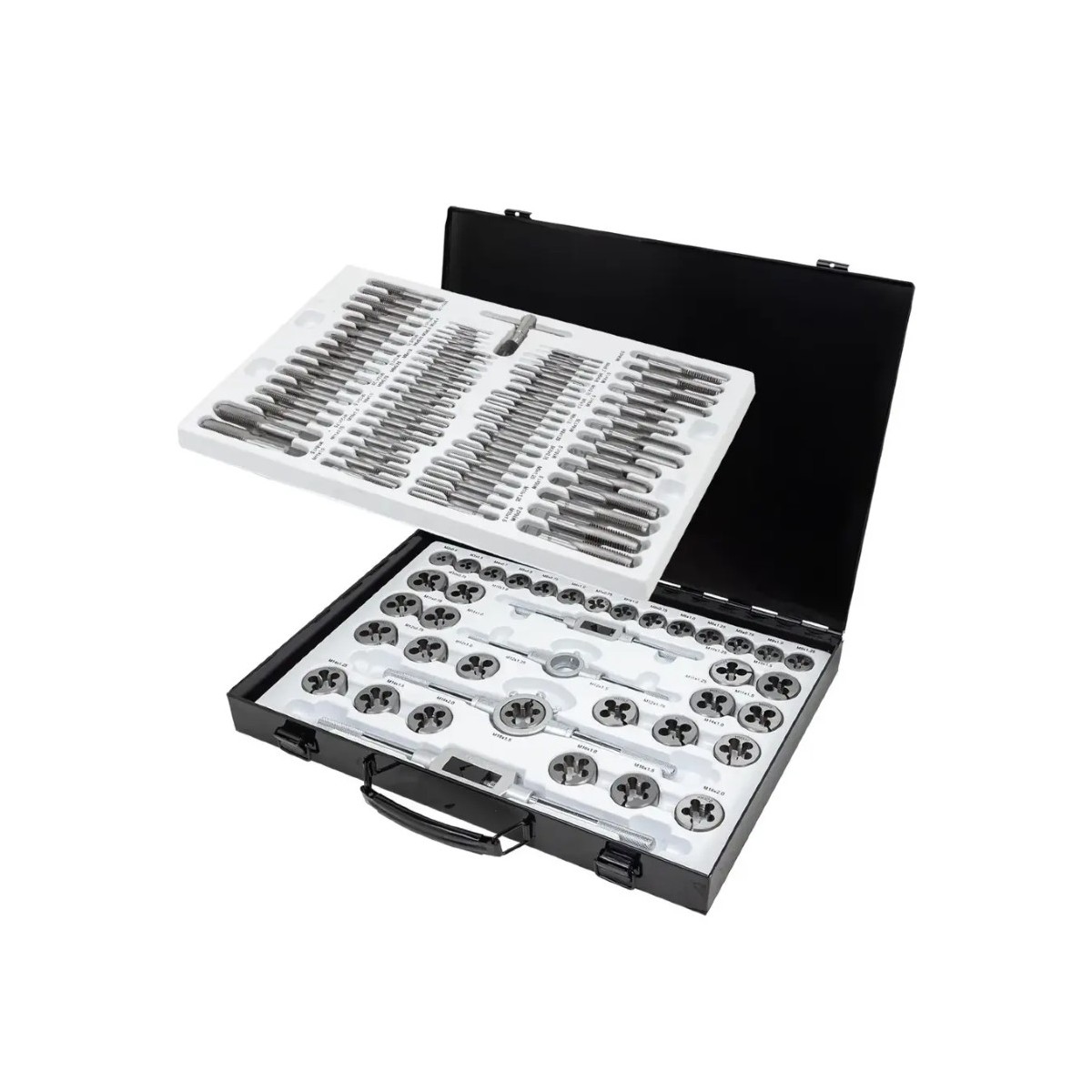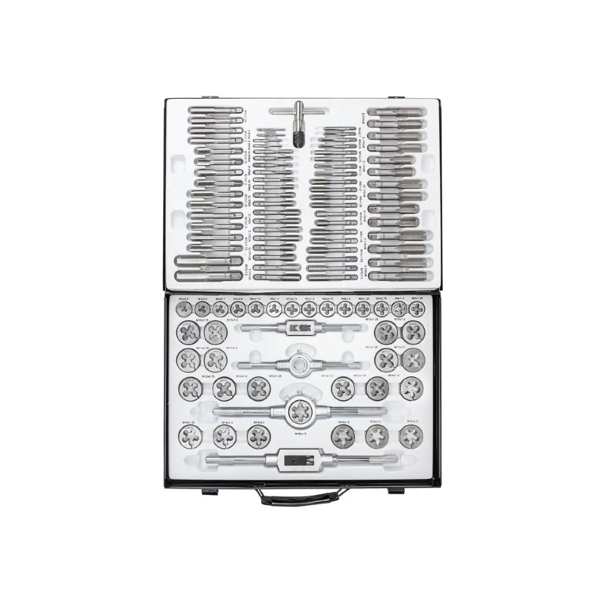 - Мітчики та плашки: М2х0.4; М3х0.5; М4х0.7; М5х0.8; М6х1; М6х1,0; М6х0,75; М7х1,0; М7х0,75; М8х1,25; М8х1,0; М8х0,75; М9х0,75; М9х1,25; М9х1,0; М10х1,5;М10х1,25; М10х1,0;М10х0,75; М11х1,5; М11х1,25; М11х1,0; М11х0,75; М12х1,75; М12х1,5; М12х1,25; М12х1,0; М12х0,75; М14х2,0; М14х1,5; М14х1,25; М14х1,0; М16х2,0; М16х1,5; М16х1,0; М18х1,5. (Набір містить мітчики та плашки відповідних розмірів)