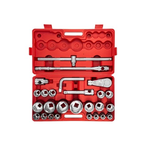 Повний функціонал приводу: Комплект включає не лише головки, але й тріскачку 3/4" (24 зуба), вороток Т-подібний, подовжувач та комір. Це гарантує наявність усіх необхідних інструментів для негайного виконання важких слюсарних робіт, усуваючи необхідність придбання привідних елементів окремо.